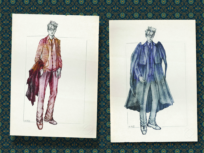 While sketching costumes in her home studio, Lindsay experienced a moment of concern. She worried about the monochromatic and uniform look of the costumes, especially the cloaks, which seemed to threaten visual diversity. Her challenge was to create varied and engaging costumes that still felt authentic to the magical universe of the play.