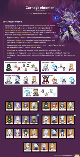 Pour optimiser la stratégie contre cet adversaire, l’utilisation de certains personnages est recommandée. Par exemple, le duo Jean et Bennett est très efficace pour briser le bouclier pyro en dispersant l’élément, tandis qu’Ambre peut rapidement détruire l’égide cryo avec ses attaques chargées et son déchaînement. De plus, combiner Ambre avec Jean, qui inflige des dégâts de chute répétés grâce à sa compétence en appui, augmente considérablement les dégâts infligés. Enfin, l’utilisation de Zhongli ou du Voyageur Géo permet de créer des structures pour bloquer la chute de l’ennemi, infligeant des dégâts massifs et facilitant sa neutralisation.