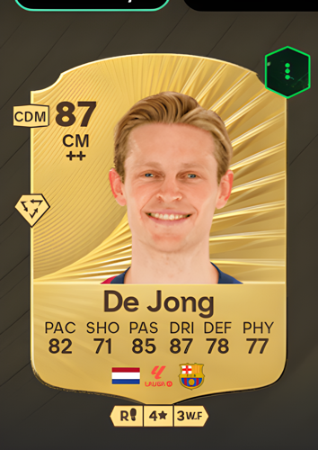 Frenkie de Jong’s Gold Rare card stands out as a top-tier Center Midfielder, boasting an impressive overall rating of 87. This card features a balanced and dynamic skill set, with 82 pace allowing for swift transitions across the pitch, 85 passing for precise distribution, and an outstanding 87 dribbling that ensures exceptional ball control under pressure. Additionally, his 78 defense and 77 physicality ratings make him a reliable presence both offensively and defensively, while a 71 shooting rating offers a credible threat from midfield. As a central midfielder, de Jong’s card excels at linking play, dictating the tempo, and providing stability, making him a crucial asset for dominating possession and orchestrating attacks in any squad.