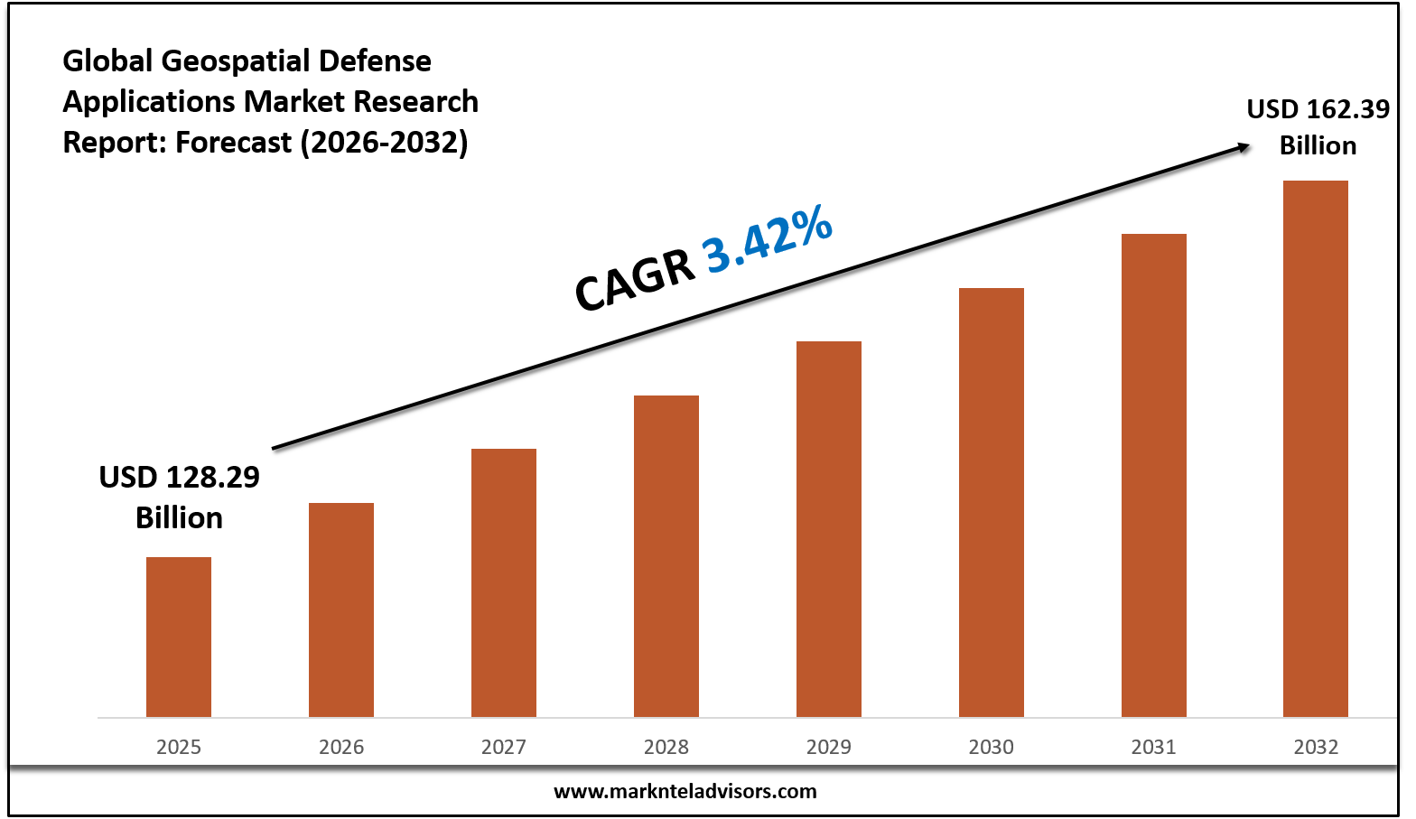 As per MarkNtel Advisors the Global Geospatial Defense Applications Market size is valued at around USD 128.29 billion in 2025 and is projected to reach USD 162.39 billion by 2032. Along with this, the market is estimated to grow at a CAGR of around 3.42% during the forecast period, i.e., 2026-32.