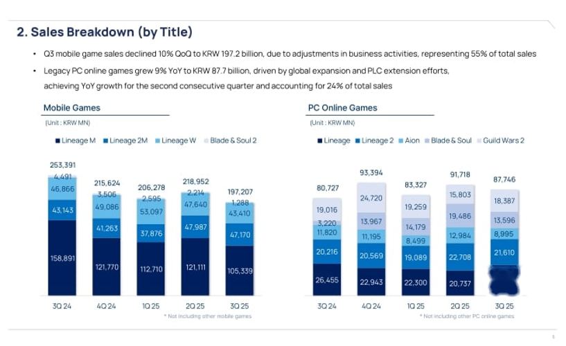 Beyond Guild Wars 2, NCsoft reported a 10% decline in overall revenue compared to Q3 2024. The downturn was primarily driven by the mobile division, which experienced a 10% year-over-year decrease, contrasting with a 9% increase in PC revenues. Notably, the gains in PC revenue were largely fueled by the success of the Blade & Soul franchise.